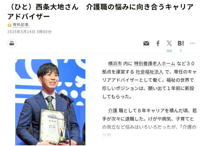 社会福祉HERO’S2024ベストヒーロー賞の西条大地さんが朝日新聞に掲載されました!